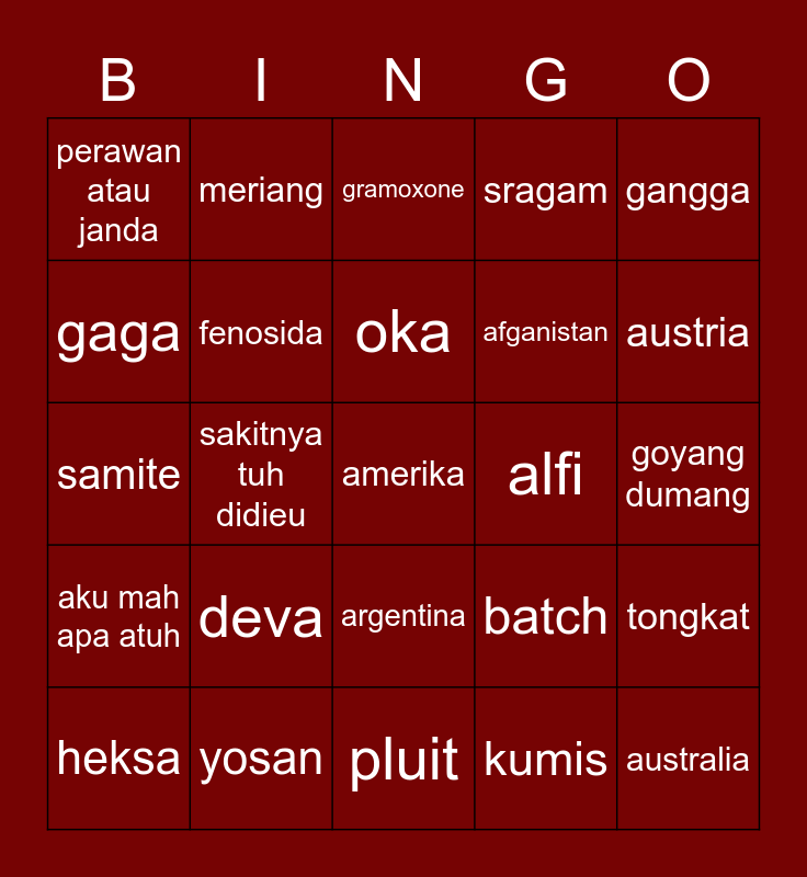 This bingo card has a free space and 24 words: deva, yosan, oka, heksa, gangga, perawan atau janda, gaga, meriang, alfi, argentina, afganistan, samite, batch, tongkat, fenosida, kumis, goyang dumang, gramoxone, austria, sakitnya tuh didieu, australia, aku mah apa atuh, sragam and pluit.