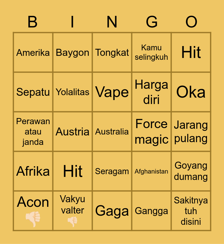 This bingo card has a free space and 24 words: Hit, Vakyu valter👎🏻, Vape, Acon👎🏻, Hit, Amerika, Sepatu, Baygon, Force magic, Seragam, Harga diri, Perawan atau janda, Afghanistan, Goyang dumang, Yolalitas, Gangga, Jarang pulang, Tongkat, Oka, Austria, Sakitnya tuh disini, Afrika, Kamu selingkuh and Gaga.