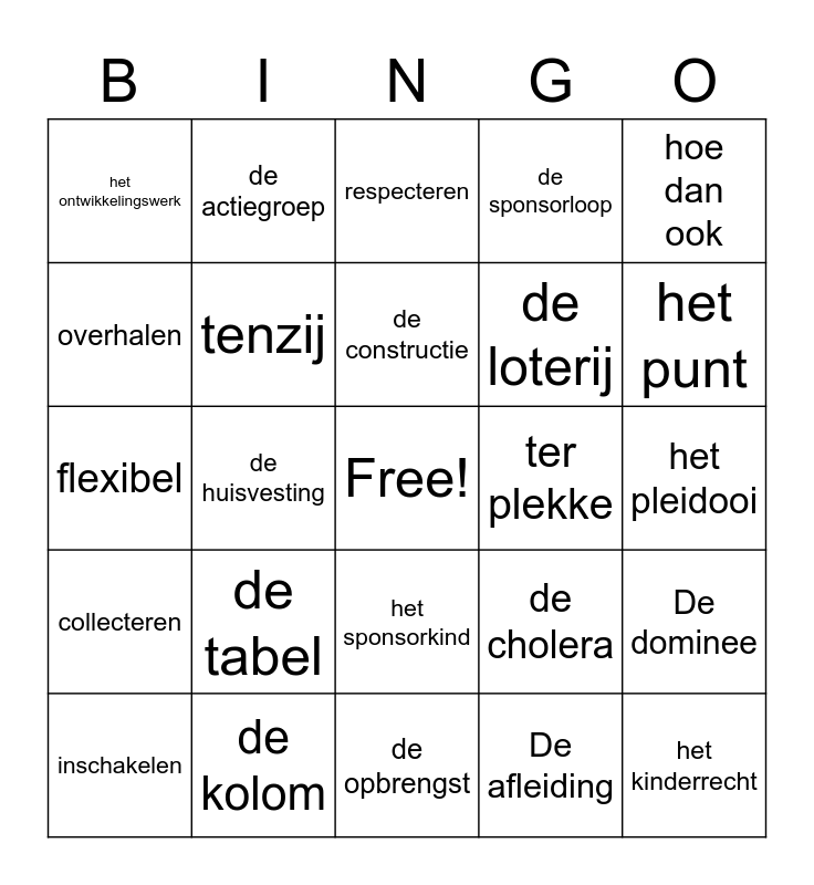 This bingo card has a free space and 56 words: het detail, inschakelen, de ondersteuning, het ontwikkelingswerk, de opbrengst, over de brug komen, tenzij, acties voor goede doelen, de loterij, de rommelmarkt, de sponsorloop, het succes, de mislukking, circa, de epidemie, er alleen voor staan, hoe dan ook, de huisvesting, ingrijpend, het kinderrecht, ter plekke, de aids, de cholera, respecteren, minachten, de constructie, heftig, iemand de hemel in prijzen, het punt, snerpen, zich als een olievlek verspreiden, zowel … als …, afwijzen, het argument, het pleidooi, overhalen, flexibel, star, collecteren, de actiegroep, het sponsorkind, de rede, de infrastructuur, ideeën uitwisselen, de stichting, de tabel, de kolom, de rij, een argument ontkrachten, iemand ruimte geven, De afleiding, De collecte, De apostrof, Het oorlogsgebied, De dominee and Het welzijn.