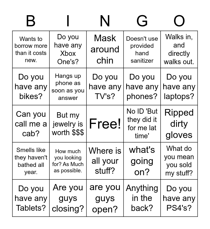 This bingo card has a free space and 24 words: How much you looking for? As Much as possible., Are you guys closing?, Do you have any TV's?, Do you have any Tablets?, Walks in, and directly walks out., Wants to borrow more than it costs new., Do you have any bikes?, Do you have any Xbox One's?, No ID 'But they did it for me lat time', Where is all your stuff?, Do you have any phones?, Can you call me a cab?, what's going on?, What do you mean you sold my stuff?, Hangs up phone as soon as you answer, Anything in the back?, Ripped dirty gloves, Mask around chin, Do you have any laptops?, But my jewelry is worth $$$, Do you have any PS4's?, Smells like they haven't bathed all year., Doesn't use provided hand sanitizer and are you guys open?.