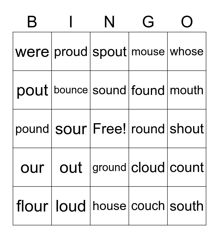 This bingo card has a free space and 24 words: out, loud, sound, flour, whose, were, pout, proud, round, ground, found, pound, cloud, count, bounce, couch, shout, spout, mouth, sour, south, our, mouse and house.