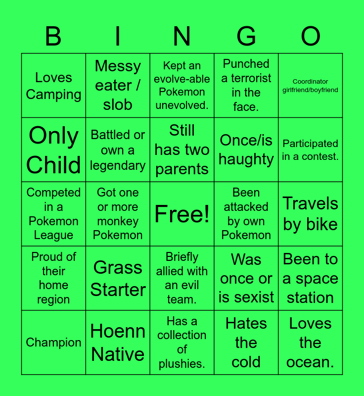 This bingo card has a free space and 24 words: Grass Starter, Hoenn Native, Still has two parents, Champion, Coordinator girlfriend/boyfriend, Loves Camping, Only Child, Messy eater / slob, Been attacked by own Pokemon, Briefly allied with an evil team., Once/is haughty, Competed in a Pokemon League, Was once or is sexist, Been to a space station, Battled or own a legendary, Hates the cold, Travels by bike, Kept an evolve-able Pokemon unevolved., Participated in a contest., Got one or more monkey Pokemon, Loves the ocean., Proud of their home region, Punched a terrorist in the face. and Has a collection of plushies..