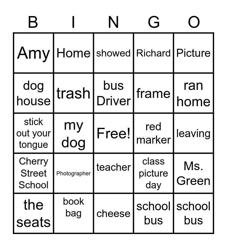 This bingo card has a free space and 24 words: Photographer, book bag, bus Driver, the seats, Picture, Amy, dog house, Home, red marker, teacher, frame, stick out your tongue, class picture day, Ms. Green, trash, school bus, leaving, showed, ran home, my dog, school bus, Cherry Street School, Richard and cheese.