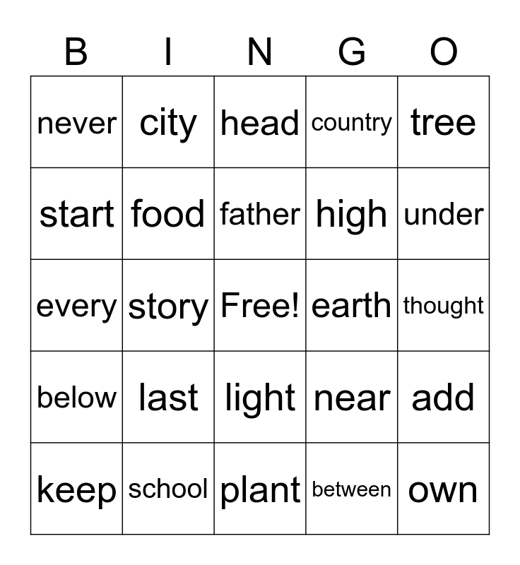 This bingo card has a free space and 24 words: last, school, father, keep, tree, never, start, city, earth, light, high, every, near, add, food, between, thought, head, under, story, own, below, country and plant.