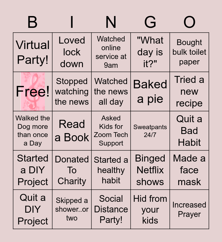 This bingo card has 3 images and 58 words: Skipped a shower..or two, Took sanity drives, Started a DIY Project, Hid from your kids, Baked bread, Stopped watching the news, Prayed with\for another choir member, Baked a pie, "It's 5 pm somewhere!", "What day is it?", Joined a Bible Study Group, Free!, Over 5 zoom meetings in a day, Bought new exercise equipment, Virtual Party!, Asked Kids for Zoom Tech Support, Bought bulk toilet paper, Watched the news all day, Sweatpants 24/7, Watched online service at 9am, Quit a DIY Project, Made a face mask, Wore pajamas all day, Completed a puzzle, Stood in line outside a grocery store, Bored Children, Tried a new recipe, Started a garden, Finished an old project, Leggings 24/7, Sang your favorite choir song, Took sanity walks, Loved lock down, Hated lock down, T-Shirts 24/7, Read a Book, Read my Bible daily, Walked the Dog more than once a Day, Rearranged A Room, Donated To Charity, Quit a Bad Habit, Wrote in a Journal, Binged Netflix shows, Had Groceries Delivered, Had Takeout Delivered, Picked up & ate takeout in your car, Social Distancing from Fridge, Started a healthy habit, Social Distance Party!, 4th of July at home Fireworks!, Practiced songs on Planning Center, Bought plants, Used Kind & Encouraging Words, Received Kind & Encouraging Words, New Courage, Increased Faith, Increased Prayer and Worship Through It.