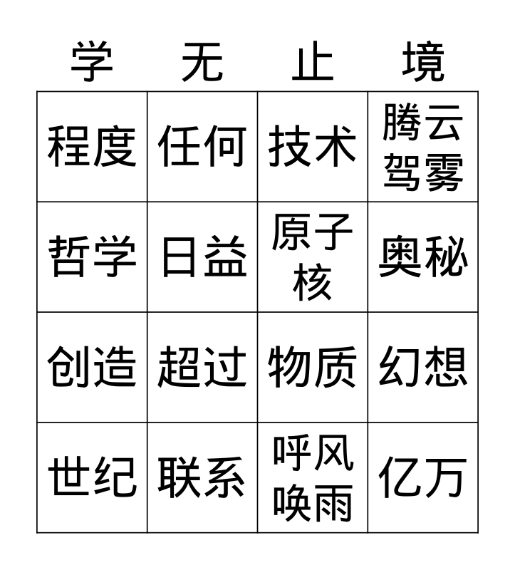 This bingo card has 17 words: 呼风 唤雨, 世纪, 技术, 程度, 超过, 腾云 驾雾, 幻想, 原子核, 奥秘, 日益, 联系, 物质, 哲学, 任何, 创造, 改善 and 亿万.