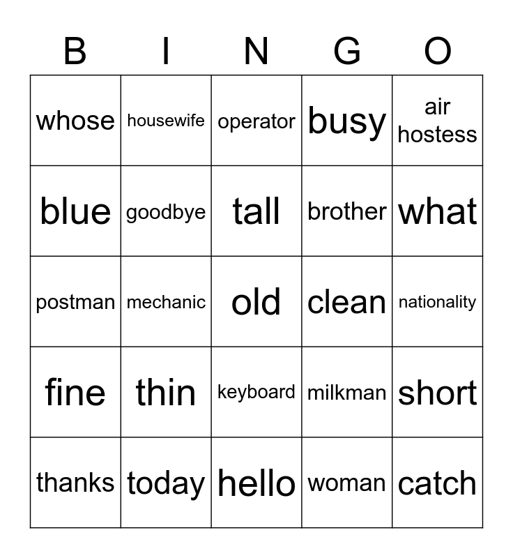 This bingo card has 42 words: lazy, tall, young, thin, woman, short, old, engineer, operator, keyboard, nationality, what, mechanic, air hostess, taxi driver, milkman, hairdresser, postman, nurse, housewife, blue, white, catch, whose, perhaps, blouse, brother, father, mother, sister, tie, fine, goodbye, hello, well, thanks, today, clean, hot, cold, busy and dirty.