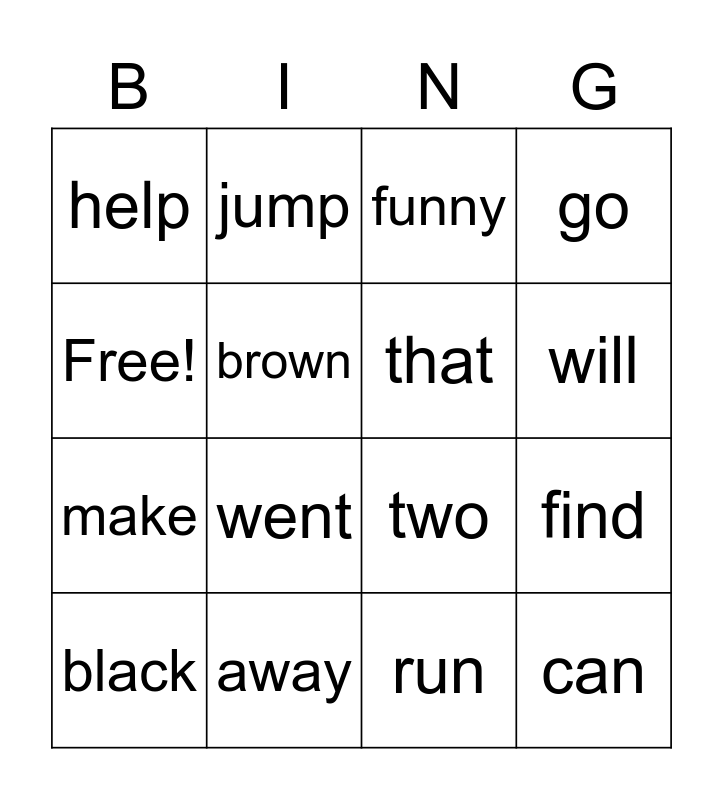 This bingo card has 16 words: away, find, funny, help, make, jump, two, run, Free!, brown, black, go, went, will, that and can.