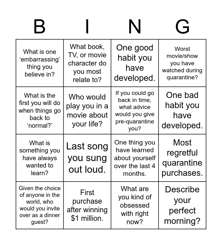 This bingo card has 20 words: Given the choice of anyone in the world, who would you invite over as a dinner guest?, Most interesting thing you have won., One good habit you have developed., Most regretful quarantine purchases., Best movie/show you have watched during quarantine?, Last song you sung out loud., What are you kind of obsessed with right now?, Worst movie/show you have watched during quarantine?, What is something you have always wanted to learn?, What book, TV, or movie character do you most relate to?, One thing you have learned about yourself over the last 4 months., One bad habit you have developed., What is one ‘embarrassing’ thing you believe in?, First purchase after winning $1 million., If you could go back in time, what advice would you give pre-quarantine you?, What food/restaurant are you craving the most?, What is the first you will do when things go back to ‘normal?’, Who would play you in a movie about your life?, If you could trade places with anyone in the world for a week, who would it be? and Describe your perfect morning?.