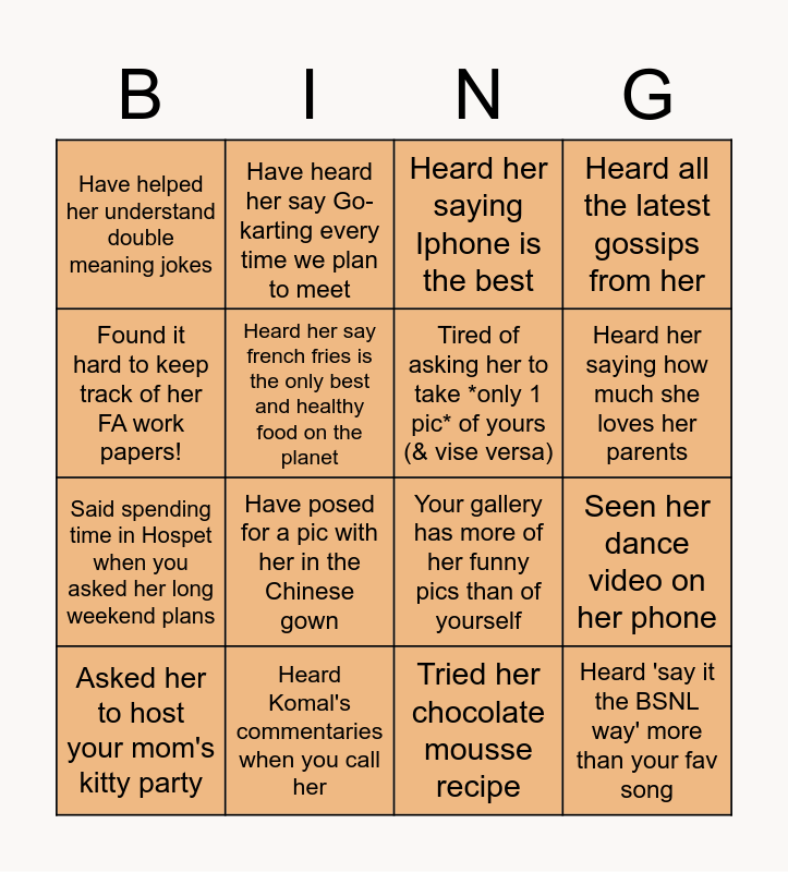 This bingo card has 16 words: Heard Komal's commentaries when you call her, Seen her dance video on her phone, Heard her saying Iphone is the best, Have helped her understand double meaning jokes, Said spending time in Hospet when you asked her long weekend plans, Have heard her say Go-karting every time we plan to meet, Your gallery has more of her funny pics than of yourself, Tried her chocolate mousse recipe, Found it hard to keep track of her FA work papers!, Heard her say french fries is the only best and healthy food on the planet, Asked her to host your mom's kitty party, Heard all the latest gossips from her, Have posed for a pic with her in the Chinese gown, Heard her saying how much she loves her parents, Tired of asking her to take *only 1 pic* of yours (& vise versa) and Heard 'say it the BSNL way' more than your fav song.