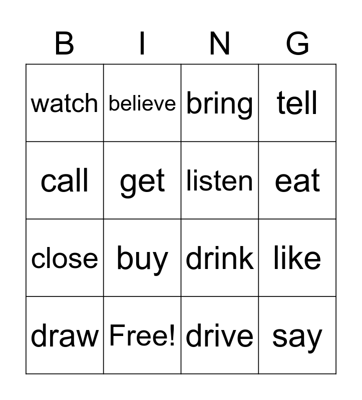 This bingo card has 25 words: see, have, eat, try, call, watch, get, believe, Free!, open, close, drink, swim, work, listen, keep, drive, bring, buy, like, draw, talk, say, tell and stop.