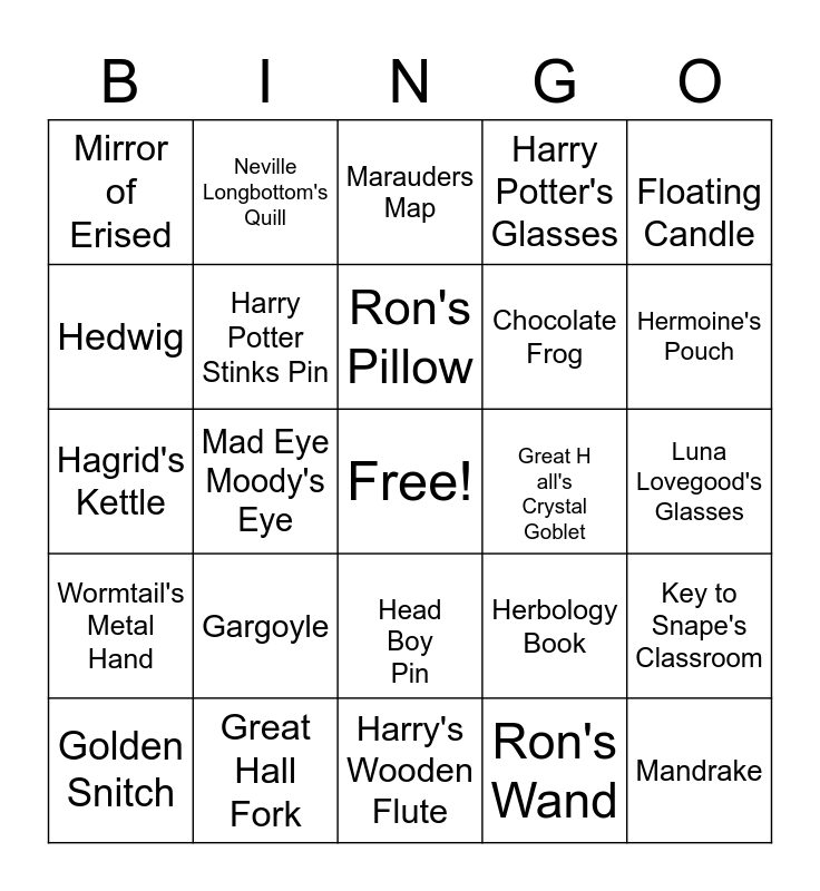 This bingo card has a free space and 24 words: Gargoyle, Great Hall Fork, Ron's Pillow, Golden Snitch, Floating Candle, Mirror of Erised, Hedwig, Neville Longbottom's Quill, Great Hall's Crystal Goblet, Head Boy Pin, Chocolate Frog, Hagrid's Kettle, Herbology Book, Key to Snape's Classroom, Harry Potter Stinks Pin, Ron's Wand, Luna Lovegood's Glasses, Marauders Map, Hermoine's Pouch, Mad Eye Moody's Eye, Mandrake, Wormtail's Metal Hand, Harry Potter's Glasses and Harry's Wooden Flute.