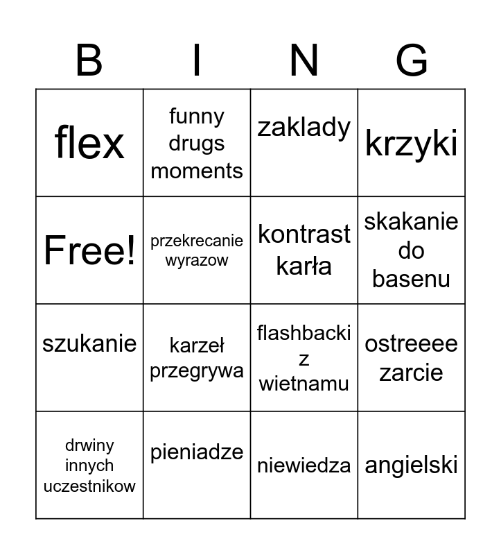This bingo card has 16 words: pieniadze, ostreeee zarcie, zaklady, flex, szukanie, funny drugs moments, flashbacki z wietnamu, niewiedza, Free!, przekrecanie wyrazow, drwiny innych uczestnikow, krzyki, karzeł przegrywa, skakanie do basenu, kontrast karła and angielski.