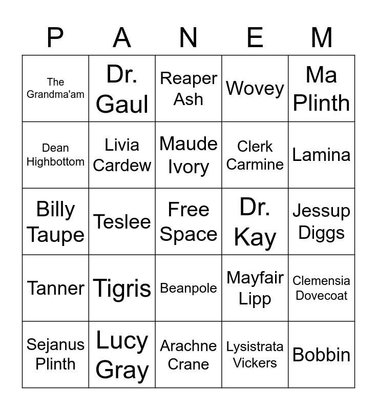 This bingo card has a free space and 24 words: Tigris, Lucy Gray, Maude Ivory, Sejanus Plinth, Ma Plinth, The Grandma'am, Dean Highbottom, Dr. Gaul, Dr. Kay, Beanpole, Clerk Carmine, Billy Taupe, Mayfair Lipp, Clemensia Dovecoat, Livia Cardew, Lysistrata Vickers, Jessup Diggs, Reaper Ash, Lamina, Teslee, Bobbin, Tanner, Wovey and Arachne Crane.