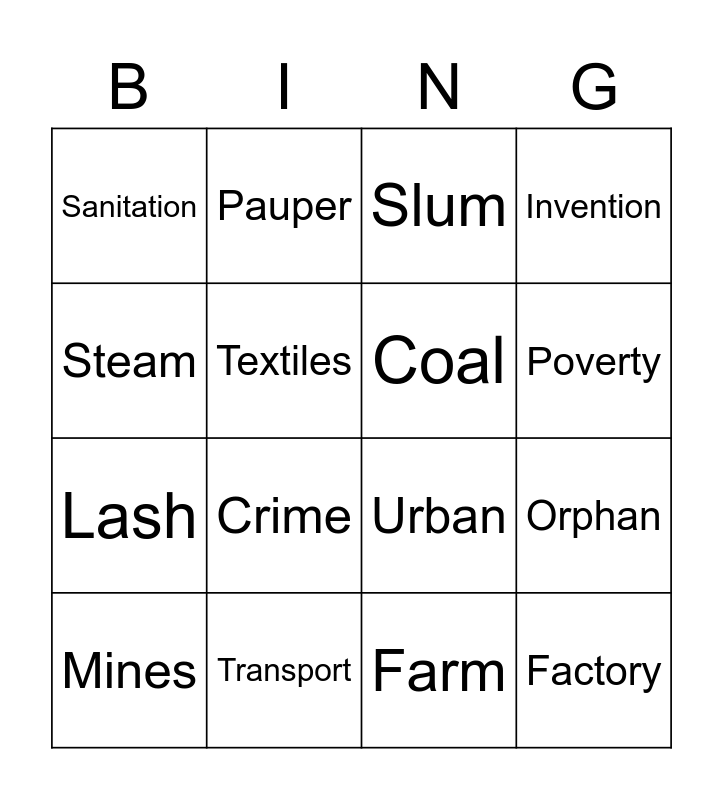 This bingo card has 16 words: Transport, Orphan, Slum, Sanitation, Lash, Pauper, Urban, Farm, Steam, Textiles, Mines, Invention, Crime, Poverty, Coal and Factory.