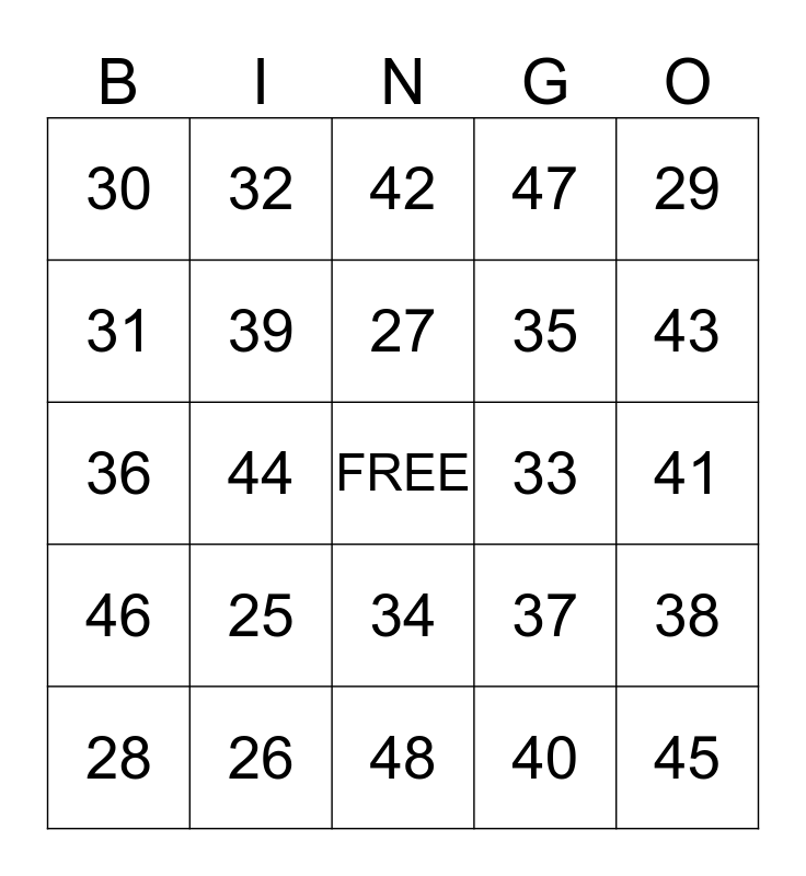 This bingo card has a free space and 24 words: 25, 26, 27, 28, 29, 30, 31, 32, 33, 34, 35, 36, 37, 38, 39, 40, 41, 42, 43, 44, 45, 46, 47 and 48.