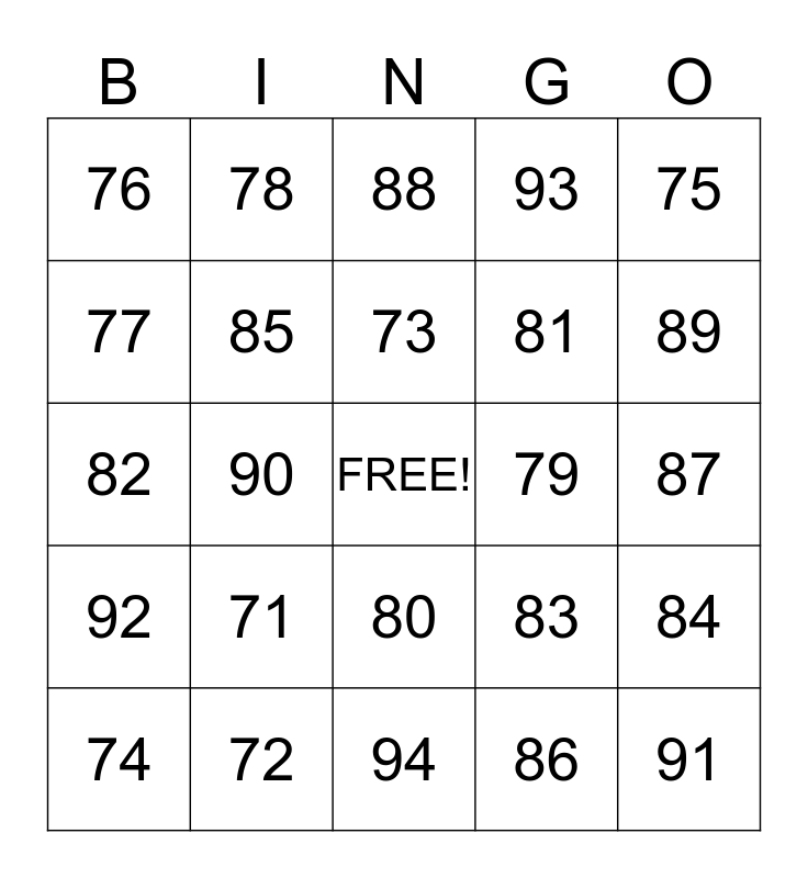 This bingo card has a free space and 24 words: 71, 72, 73, 74, 75, 76, 77, 78, 79, 80, 81, 82, 83, 84, 85, 86, 87, 88, 89, 90, 91, 92, 93 and 94.