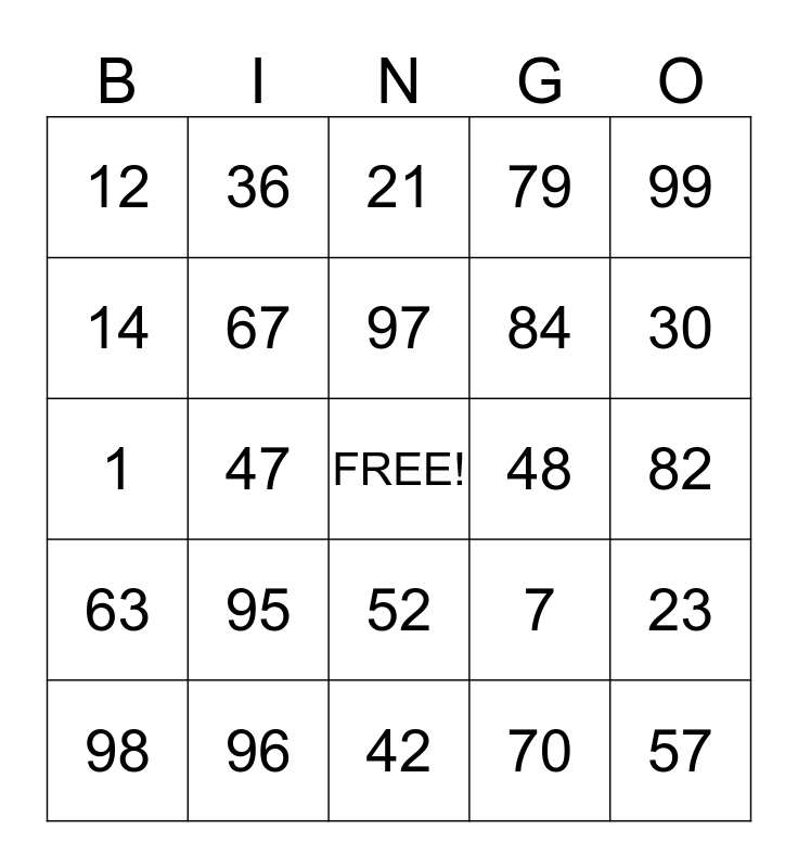This bingo card has a free space and 24 words: 95, 96, 97, 98, 99, 12, 14, 36, 48, 52, 84, 1, 7, 23, 67, 70, 82, 21, 30, 47, 57, 63, 79 and 42.