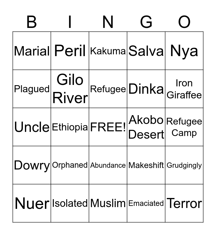 This bingo card has a free space and 24 words: Orphaned, Isolated, Refugee, Nuer, Nya, Marial, Plagued, Peril, Akobo Desert, Abundance, Dinka, Uncle, Makeshift, Grudgingly, Gilo River, Emaciated, Refugee Camp, Kakuma, Iron Giraffee, Ethiopia, Terror, Dowry, Salva and Muslim.