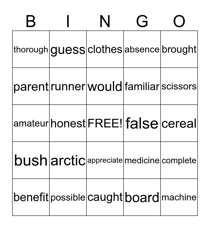 This bingo card has a free space and 24 words: arctic, possible, would, benefit, brought, thorough, parent, guess, false, appreciate, familiar, amateur, medicine, complete, runner, board, cereal, clothes, scissors, honest, machine, bush, absence and caught.