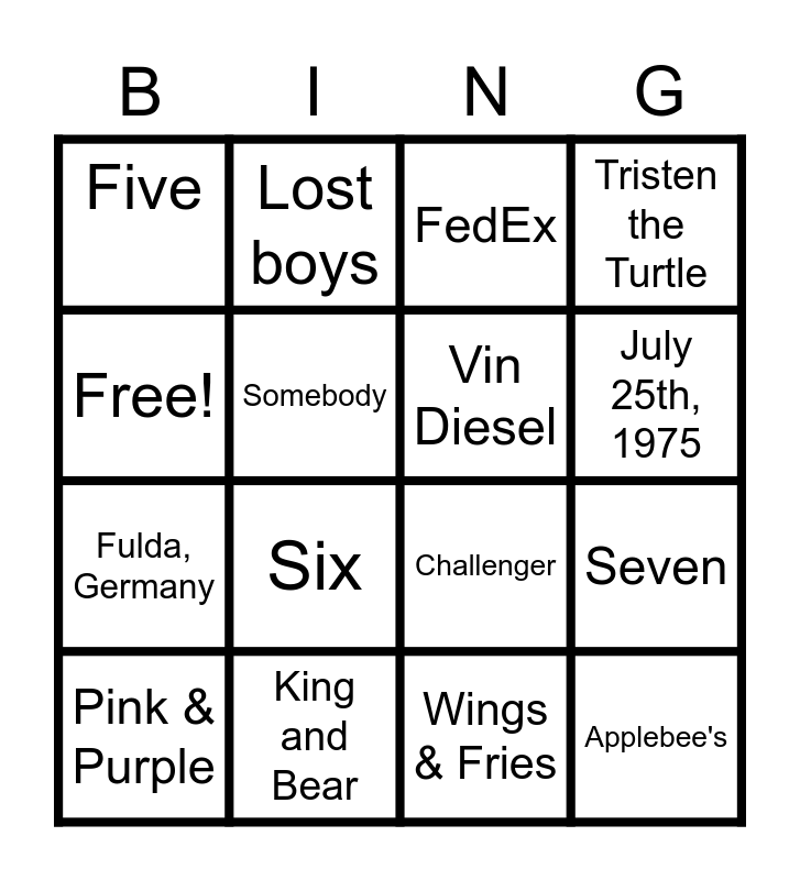 This bingo card has 16 words: King and Bear, Seven, FedEx, Five, Fulda, Germany, Lost boys, Challenger, Wings & Fries, Free!, Somebody, Pink & Purple, Tristen the Turtle, Six, July 25th, 1975, Vin Diesel and Applebee's.