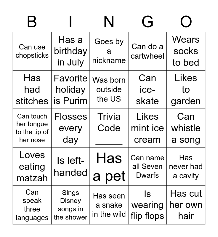 This bingo card has a free space and 24 words: Is left-handed, Sings Disney songs in the shower, Was born outside the US, Can speak three languages, Wears socks to bed, Can use chopsticks, Has had stitches, Has a birthday in July, Likes mint ice cream, Has a pet, Can ice-skate, Can touch her tongue to the tip of her nose, Can name all Seven Dwarfs, Has never had a cavity, Favorite holiday is Purim, Is wearing flip flops, Can whistle a song, Goes by a nickname, Likes to garden, Flosses every day, Has cut her own hair, Loves eating matzah, Can do a cartwheel and Has seen a snake in the wild.