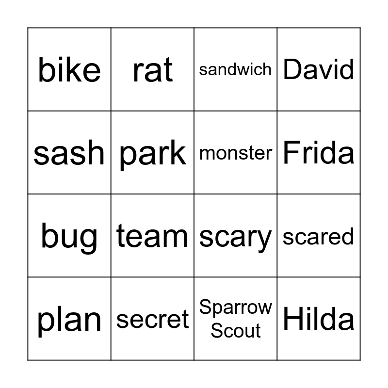 This bingo card has 20 words: scared, dream, sandwich, badge, plan, sash, secret, bike, bug, rat, team, scary, park, Hilda, monster, mulch, Frida, David, Sparrow Scout and nightmare.