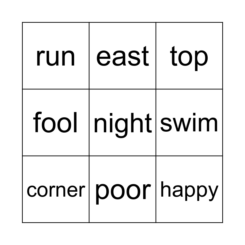 This bingo card has a free space and 14 words: arm, busy, corner, east, fool, happy, jump, lucky, poor, run, smile, swim, top and where.