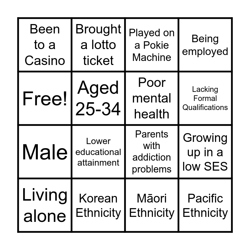 This bingo card has 16 words: Korean Ethnicity, Growing up in a low SES, Played on a Pokie Machine, Been to a Casino, Male, Brought a lotto ticket, Parents with addiction problems, Māori Ethnicity, Free!, Aged 25-34, Living alone, Being employed, Lower educational attainment, Lacking Formal Qualifications, Poor mental health and Pacific Ethnicity.