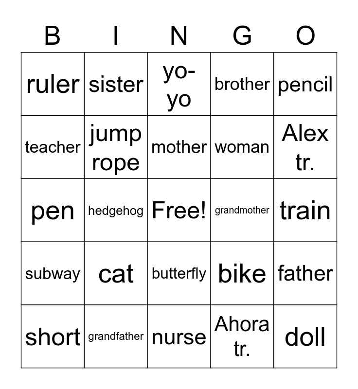 This bingo card has a free space and 29 words: short, long, hedgehog, car, ruler, yo-yo, jump rope, cat, grandmother, grandfather, train, doll, nurse, Ahora tr., Alex tr., doctor, butterfly, subway, pencil, pen, bike, flower, woman, teacher, brother, sister, father, mother and tree.