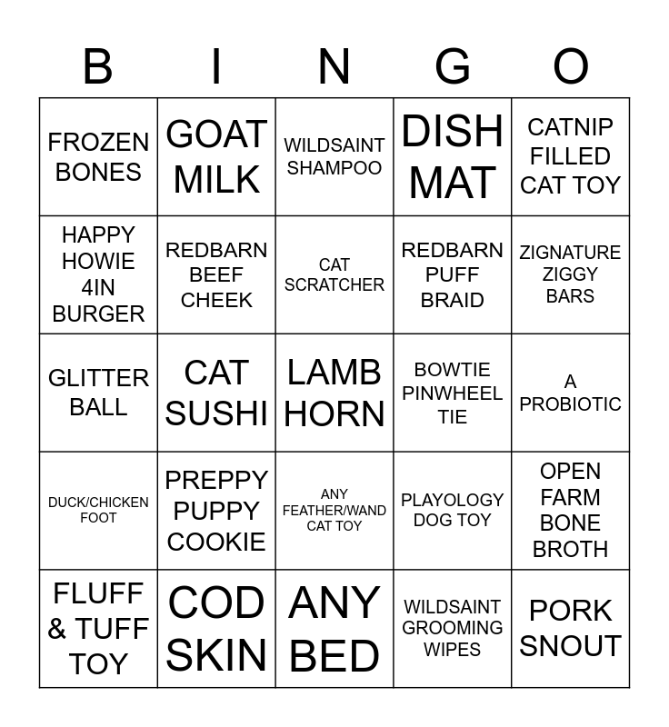 This bingo card has 25 words: DUCK/CHICKEN FOOT, COD SKIN, LAMB HORN, WILDSAINT GROOMING WIPES, CATNIP FILLED CAT TOY, FROZEN BONES, GOAT MILK, WILDSAINT SHAMPOO, BOWTIE PINWHEEL TIE, OPEN FARM BONE BROTH, HAPPY HOWIE 4IN BURGER, REDBARN BEEF CHEEK, ANY BED, PLAYOLOGY DOG TOY, ZIGNATURE ZIGGY BARS, FLUFF & TUFF TOY, CAT SUSHI, CAT SCRATCHER, REDBARN PUFF BRAID, A PROBIOTIC, GLITTER BALL, PREPPY PUPPY COOKIE, ANY FEATHER/WAND CAT TOY, DISH MAT and PORK SNOUT.