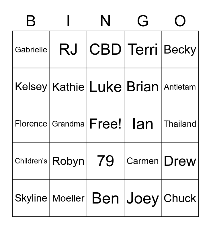 This bingo card has a free space and 49 words: Tony, Chuck, Grandpa, Ben, Robyn, Andy, RJ, Bernie, Kelsey, Kevin, Kathie, Terri, Drew, Carmen, Kathy, Frank, Luke, Ian, Kyle, Becky, Grandma, Joey, Gabrielle, Brian, Malorie, Antietam, Skyline, Kenwood, 79, Children's, 5, Lakeview, California, 8, Moeller, coach, basketball, football, Thailand, 7, Horn, towel, captain, dominoes, Florence, CBD, yoga, 6 and tips.
