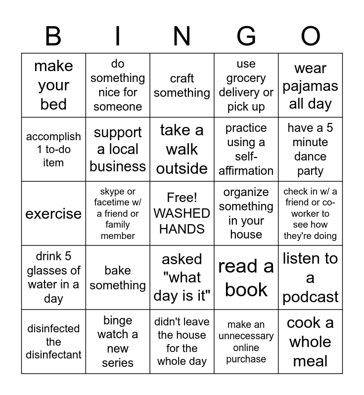 This bingo card has a free space and 24 words: bake something, binge watch a new series, take a walk outside, disinfected the disinfectant, wear pajamas all day, make your bed, accomplish 1 to-do item, do something nice for someone, organize something in your house, asked "what day is it", practice using a self-affirmation, exercise, read a book, listen to a podcast, support a local business, make an unnecessary online purchase, check in w/ a friend or co-worker to see how they're doing, craft something, have a 5 minute dance party, skype or facetime w/ a friend or family member, cook a whole meal, drink 5 glasses of water in a day, use grocery delivery or pick up and didn't leave the house for the whole day.