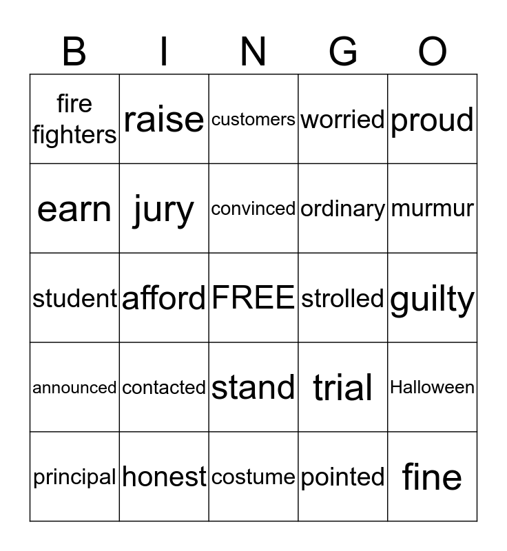 This bingo card has a free space and 29 words: principal, figure, afford, soared, fire fighters, customers, jury, contacted, strolled, honest, guilty, fine, costume, pointed, murmur, block, stand, announced, proud, student, trial, spreading, ordinary, earn, worried, raise, Halloween, convinced and certainly.