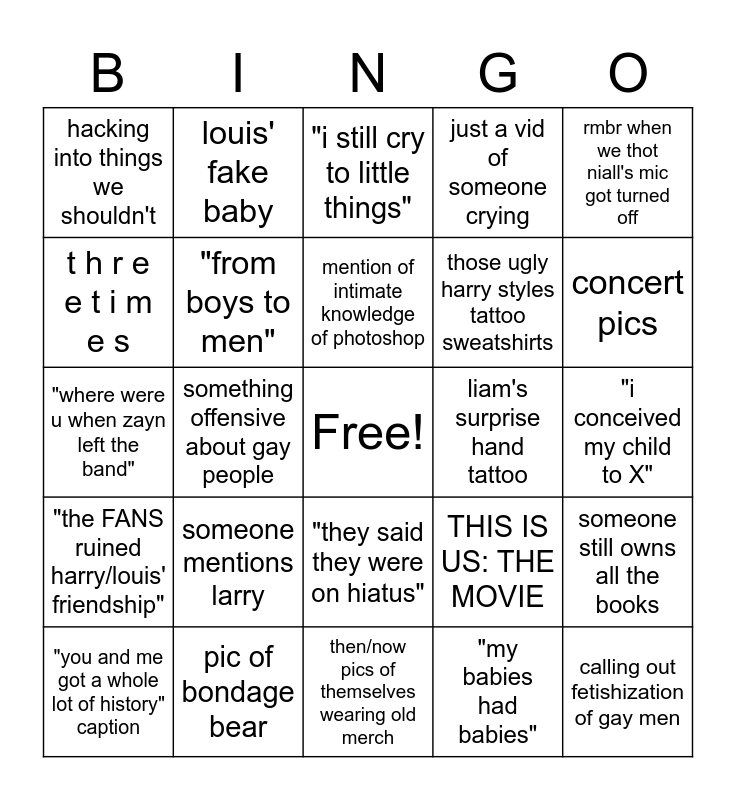 This bingo card has a free space and 24 words: someone mentions larry, pic of bondage bear, mention of intimate knowledge of photoshop, "you and me got a whole lot of history" caption, rmbr when we thot niall's mic got turned off, hacking into things we shouldn't, t h r e e t i m e s, louis' fake baby, liam's surprise hand tattoo, "they said they were on hiatus", those ugly harry styles tattoo sweatshirts, "where were u when zayn left the band", THIS IS US: THE MOVIE, someone still owns all the books, "from boys to men", "my babies had babies", "i conceived my child to X", "i still cry to little things", concert pics, something offensive about gay people, calling out fetishization of gay men, "the FANS ruined harry/louis' friendship", just a vid of someone crying and then/now pics of themselves wearing old merch.