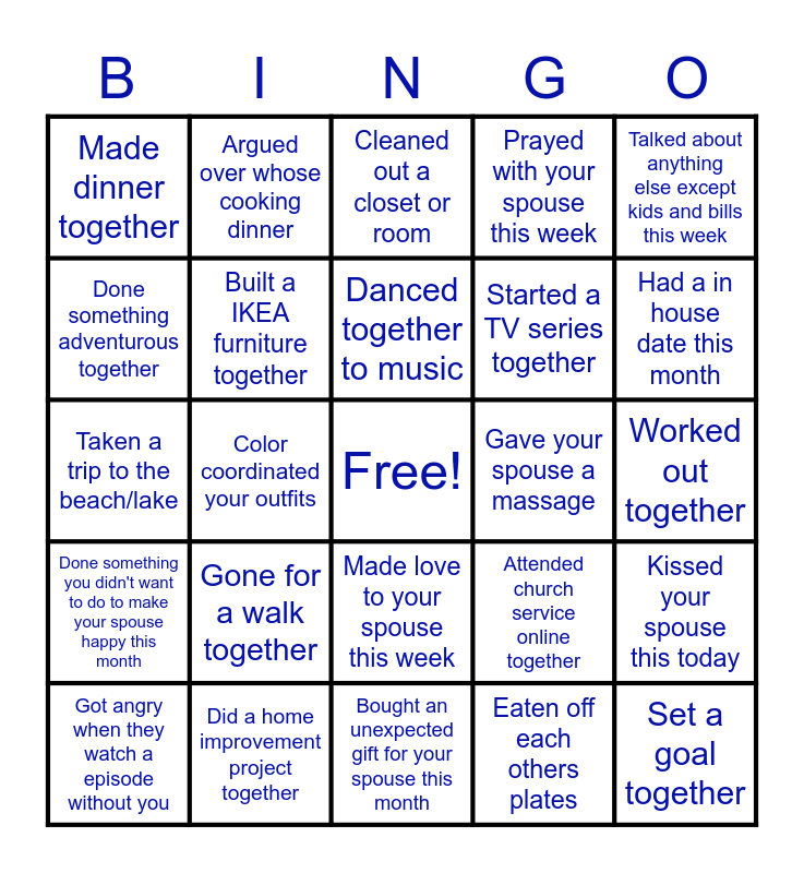 This bingo card has a free space and 24 words: Gone for a walk together, Did a home improvement project together, Danced together to music, Got angry when they watch a episode without you, Talked about anything else except kids and bills this week, Made dinner together, Done something adventurous together, Argued over whose cooking dinner, Gave your spouse a massage, Made love to your spouse this week, Started a TV series together, Taken a trip to the beach/lake, Attended church service online together, Kissed your spouse this today, Built a IKEA furniture together, Eaten off each others plates, Worked out together, Cleaned out a closet or room, Had a in house date this month, Color coordinated your outfits, Set a goal together, Done something you didn't want to do to make your spouse happy this month, Prayed with your spouse this week and Bought an unexpected gift for your spouse this month.
