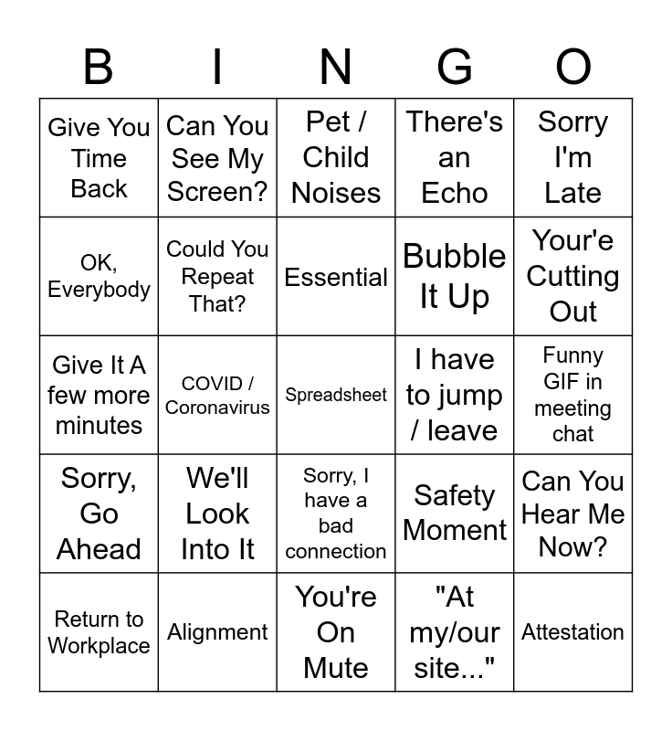 This bingo card has 25 words: We'll Look Into It, You're On Mute, Essential, Return to Workplace, Sorry I'm Late, Give You Time Back, OK, Everybody, Can You See My Screen?, I have to jump / leave, Sorry, I have a bad connection, Bubble It Up, Give It A few more minutes, Safety Moment, Can You Hear Me Now?, Could You Repeat That?, Attestation, Funny GIF in meeting chat, Pet / Child Noises, Your'e Cutting Out, COVID / Coronavirus, Spreadsheet, Alignment, Sorry, Go Ahead, There's an Echo and "At my/our site...".