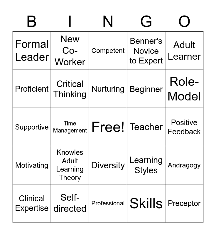This bingo card has a free space and 24 words: Knowles Adult Learning Theory, Self-directed, Nurturing, Clinical Expertise, Adult Learner, Formal Leader, Proficient, New Co-Worker, Teacher, Diversity, Beginner, Supportive, Learning Styles, Andragogy, Critical Thinking, Skills, Positive Feedback, Competent, Role-Model, Time Management, Preceptor, Motivating, Benner's Novice to Expert and Professional.