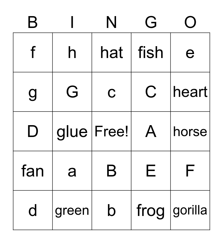 This bingo card has a free space and 25 words: a, b, c, d, e, f, g, h, A, B, C, D, E, F, G, H, horse, hat, heart, glue, gorilla, green, fan, fish and frog.