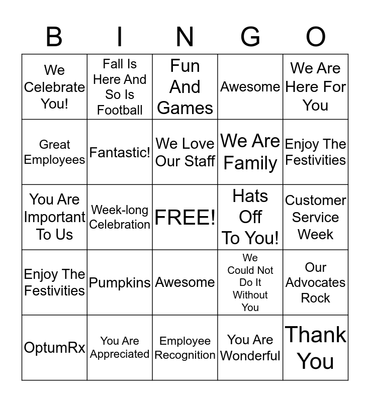 This bingo card has a free space and 24 words: Pumpkins, You Are Appreciated, We Love Our Staff, OptumRx, We Are Here For You, We Celebrate You!, Great Employees, Fall Is Here And So Is Football, Hats Off To You!, Awesome, We Are Family, You Are Important To Us, We Could Not Do It Without You, Our Advocates Rock, Fantastic!, You Are Wonderful, Customer Service Week, Fun And Games, Enjoy The Festivities, Week-long Celebration, Thank You, Enjoy The Festivities, Awesome and Employee Recognition.