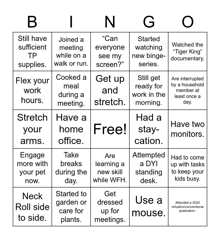 This bingo card has a free space and 75 words: Hug yourself., “Sorry I was on mute.”, “Can everyone see my screen?”, Forgot what day of the week it is., Decorated your home for a holiday., Met a co-workers kid via chime., Tried ordering groceries online., Started reading a new book., Tried a DIY project., Ran out of hand-sanitizer., Attended a Zoom party., Played a virtual game with others., Get up and stretch., Flex your work hours., Have a designated space to work., Have a home office., Had a hiring freeze., Attended a 2020 virtual/unconventional graduation., Had to setup a child’s computer or study station for home-schooling., Watched the “Tiger King” documentary., Used a food-delivery service like Uber-eats., Stretch your arms., Cooked a meal during a meeting., Joined a meeting while on a walk or run., Started watching new binge-series., Tried cooking a new recipe., Did laundry during a meeting., Have the TV on during work hours., Ate breakfast every day this week., Have music on during work hours., Drink more than 2 cups of coffee a day., Wore pajamas to a meeting., Massage your shoulders., Attempted a DYI standing desk., Are interrupted by a household member at least once a day., Still get ready for work in the morning., Have a designated place to work from home every day., Use a desk that doubles as a table., Have two monitors., Use a mouse., Ran into an IT issue during WFH., Have watched more TV than normal., Started doing more exercise., Have kids at home most of the day., Enjoy some alone time away from work., Used up most of the food in your pantry., Neck Roll side to side., Still have sufficient TP supplies., Did panic shopping before COVID-19 closures., Started a new DYI home project., Attend virtual Happy Hours., Are learning a new skill while WFH., Order all your supplies online., Bend to touch your calfs or feet., Got cabin fever., Miss going to work., Miss the commute., Do not miss the commute., Keep the same sleep schedule., Twist body side to side., Take breaks during the day., Unplug after 6PM, Reorganized or decluttered a space in your home., Your Alexa or Google device woke up during a meeting., Got a haircut at home., Had a stay-cation., Reach up stretch & side to side reach., Hold a power pose (superhero)., A family member walked in during a meeting., Had to come up with tasks to keep your kids busy., Engage more with your pet now., Started to garden or care for plants., Still iron your clothes., Get dressed up for meetings. and Bend to touch your calfs or feet..