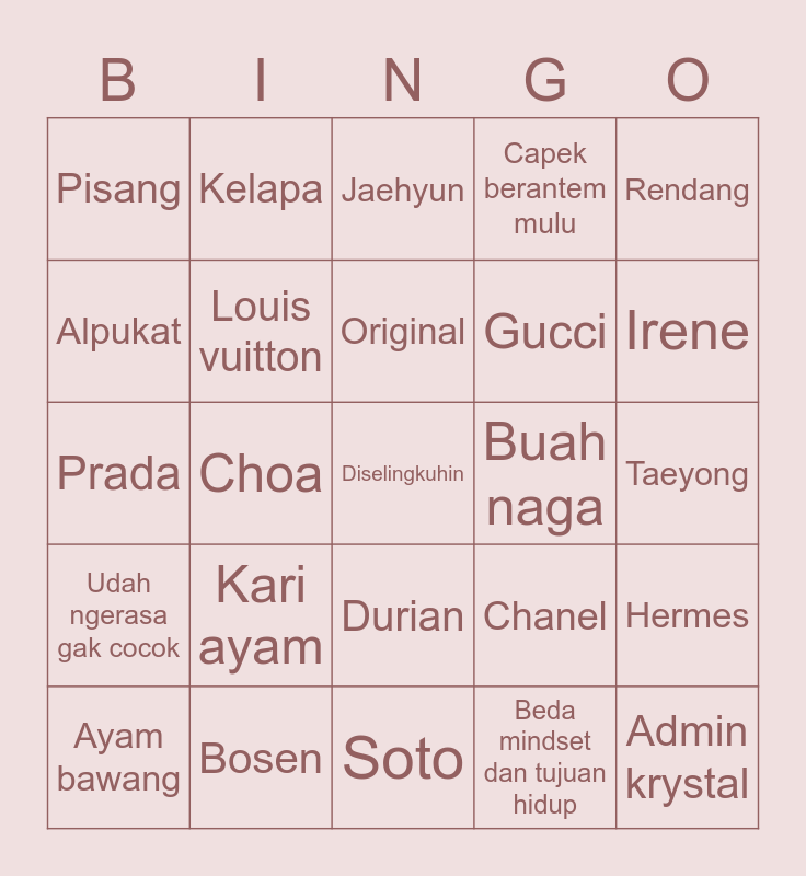 This bingo card has 25 words: Kari ayam, Soto, Original, Ayam bawang, Rendang, Pisang, Alpukat, Kelapa, Buah naga, Durian, Gucci, Prada, Chanel, Hermes, Louis vuitton, Admin krystal, Taeyong, Jaehyun, Irene, Choa, Diselingkuhin, Bosen, Udah ngerasa gak cocok, Capek berantem mulu and Beda mindset dan tujuan hidup.