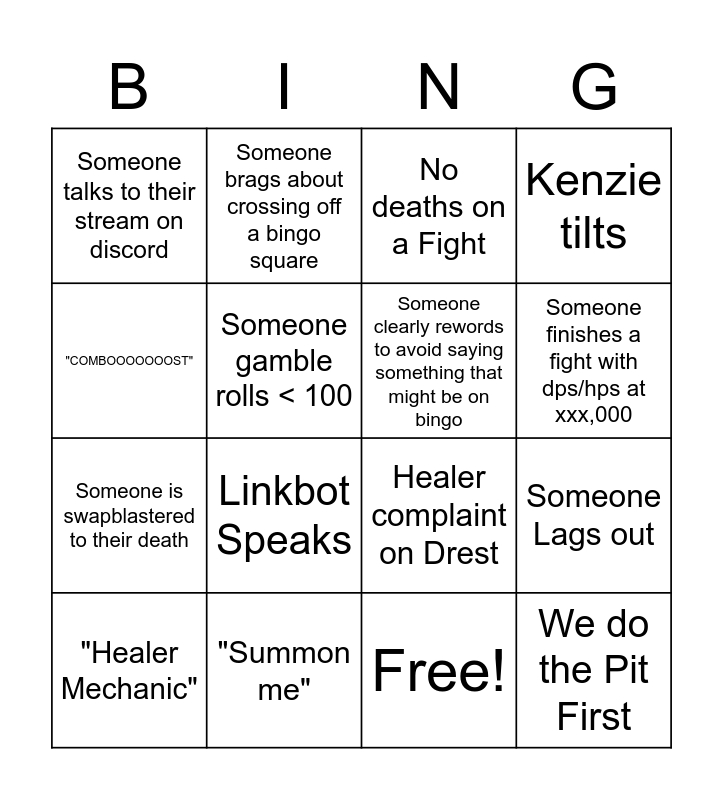 This bingo card has 17 words: Free!, "Healer Mechanic", No deaths on a Fight, Someone talks to their stream on discord, Linkbot Speaks, Kenzie tilts, Someone Lags out, Someone clearly rewords to avoid saying something that might be on bingo, Someone finishes a fight with dps/hps at xxx,000, Someone gamble rolls < 100, "Summon me", Healer complaint on Drest, "COMBOOOOOOOST", Someone brags about crossing off a bingo square, Someone is swapblastered to their death, Someone gamble rolls > 9900 and We do the Pit First.