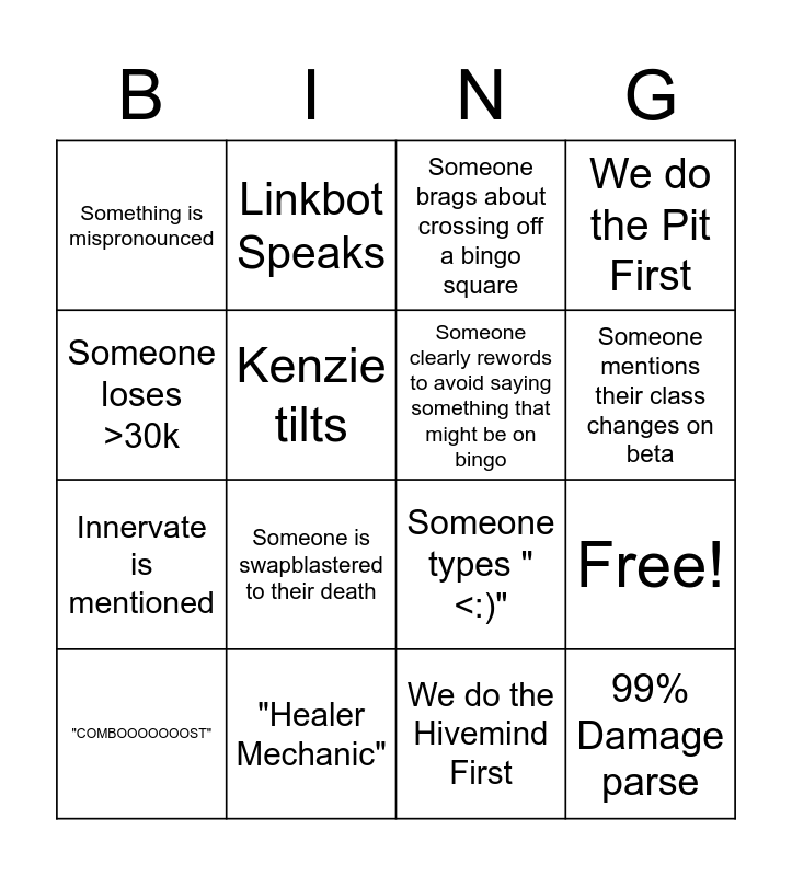 This bingo card has 20 words: Free!, Shade mentions her Paladin, Someone brags about crossing off a bingo square, No deaths on a Fight, "COMBOOOOOOOST", Someone loses >30k, "Healer Mechanic", Something is mispronounced, Innervate is mentioned, Linkbot Speaks, Someone is swapblastered to their death, Someone types "<:)", Kenzie tilts, 99% Damage parse, Someone clearly rewords to avoid saying something that might be on bingo, BoE Drops, Someone mentions their class changes on beta, We do the Pit First, We do the Hivemind First and We do Xanesh First.