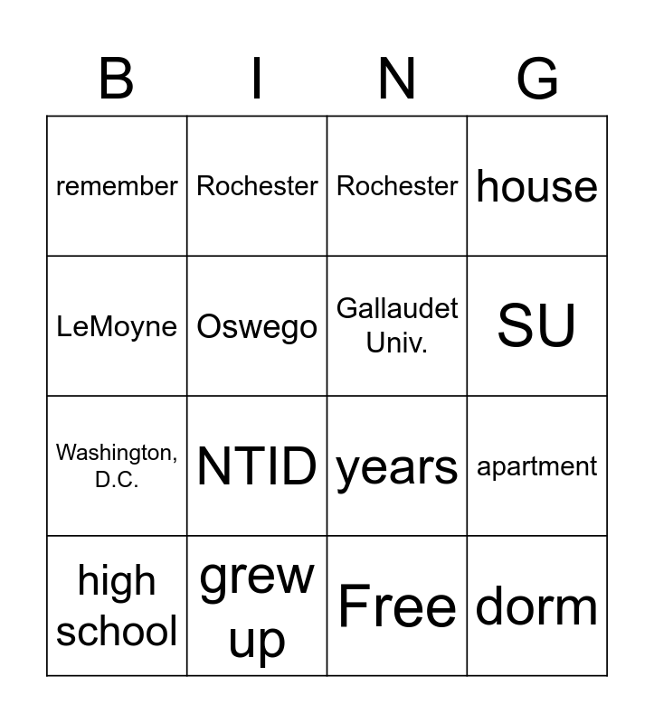 This bingo card has 17 words: Free, high school, Rochester, remember, NTID, house, apartment, Gallaudet Univ., SU, Oswego, grew up, years, LeMoyne, Rochester, Washington, D.C., hearing and dorm.