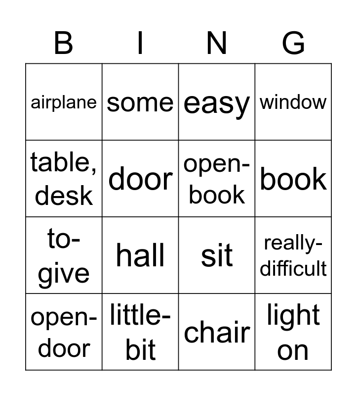 This bingo card has 16 words: little-bit, really-difficult, easy, airplane, to-give, some, sit, chair, table, desk, door, open-door, window, hall, book, open-book and light on.