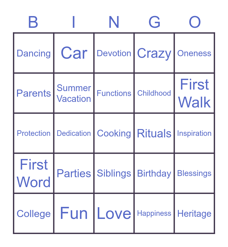 This bingo card has 64 words: Arguments, Bedtime, Birth, Birthday, Blessings, Bond, Car, Care, Childhood, Cleaning, College, Comfort, Cooking, Crazy, Culture, Dancing, Dedication, Devotion, Family Tree, First Walk, First Word, Fun, Functions, Gatherings, Get together, Goodbyes, Grandparents, Guests, Happiness, Heritage, Holiday, Home, Hugs, In laws, Inspiration, Laughter, Loan, Love, Medicines, Oneness, Parents, Parties, Pet, Picnic, Prayers, Protection, Relatives, Reunions, Rituals, Sacrifice, Secrets, Shopping, Siblings, Stories, Strength, Subah Ki Chai, Summer Vacation, Tears, Togetherness, Travel, Trust, Unity, Values and Weddings.