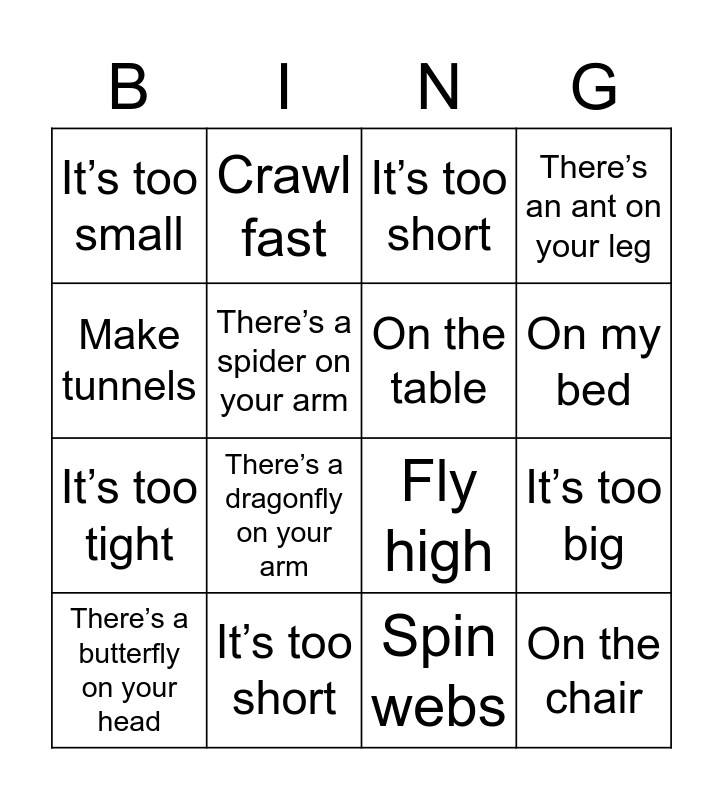 This bingo card has 16 words: It’s too short, It’s too big, It’s too short, It’s too small, It’s too tight, Crawl fast, Fly high, Spin webs, Make tunnels, There’s a spider on your arm, There’s a butterfly on your head, There’s an ant on your leg, There’s a dragonfly on your arm, On my bed, On the table and On the chair.