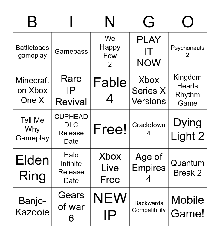 This bingo card has a free space and 24 words: Halo Infinite Release Date, Gears of war 6, Fable 4, Banjo-Kazooie, Psychonauts 2, Battletoads gameplay, Minecraft on Xbox One X, Gamepass, Crackdown 4, Xbox Live Free, Xbox Series X Versions, Tell Me Why Gameplay, Age of Empires 4, Quantum Break 2, Rare IP Revival, Backwards Compatibility, Dying Light 2, We Happy Few 2, Kingdom Hearts Rhythm Game, CUPHEAD DLC Release Date, Mobile Game!, Elden Ring, PLAY IT NOW and NEW IP.