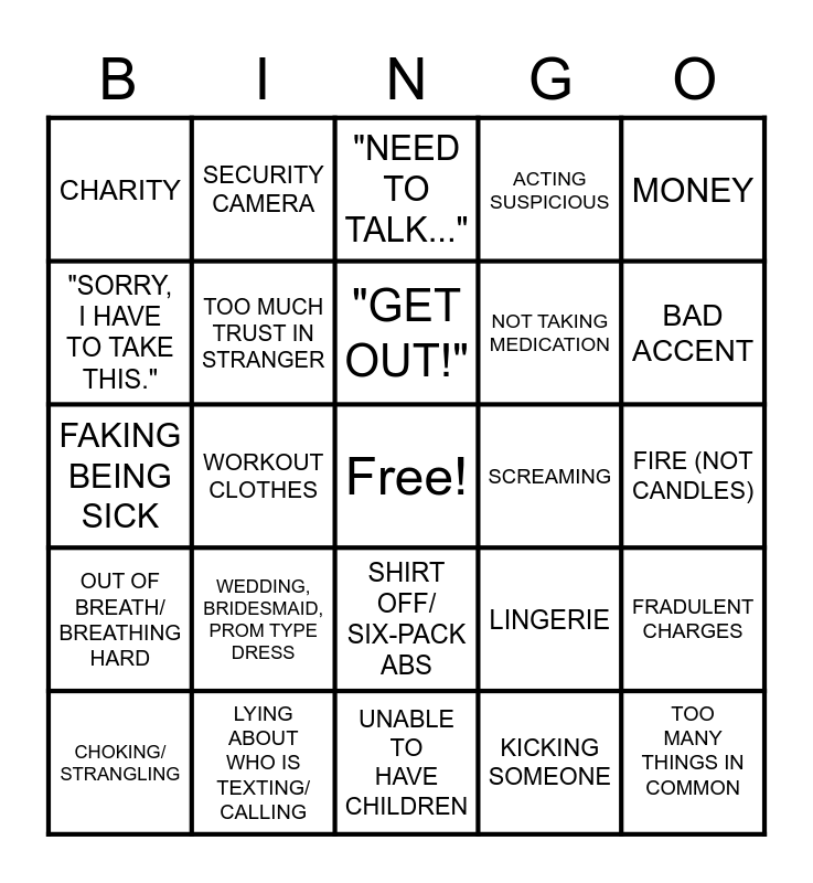 This bingo card has a free space and 24 words: WEDDING, BRIDESMAID, PROM TYPE DRESS, LYING ABOUT WHO IS TEXTING/ CALLING, "GET OUT!", CHOKING/ STRANGLING, MONEY, CHARITY, "SORRY, I HAVE TO TAKE THIS.", SECURITY CAMERA, SCREAMING, SHIRT OFF/ SIX-PACK ABS, NOT TAKING MEDICATION, FAKING BEING SICK, LINGERIE, FRADULENT CHARGES, TOO MUCH TRUST IN STRANGER, KICKING SOMEONE, FIRE (NOT CANDLES), "NEED TO TALK...", BAD ACCENT, WORKOUT CLOTHES, TOO MANY THINGS IN COMMON, OUT OF BREATH/ BREATHING HARD, ACTING SUSPICIOUS and UNABLE TO HAVE CHILDREN.